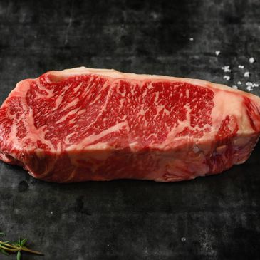Steak from the back of the cow with a well marbled center and a strip of fat down one side. Cut from the shorter side of the beef loin, the muscles in this area do little work which mean tender.